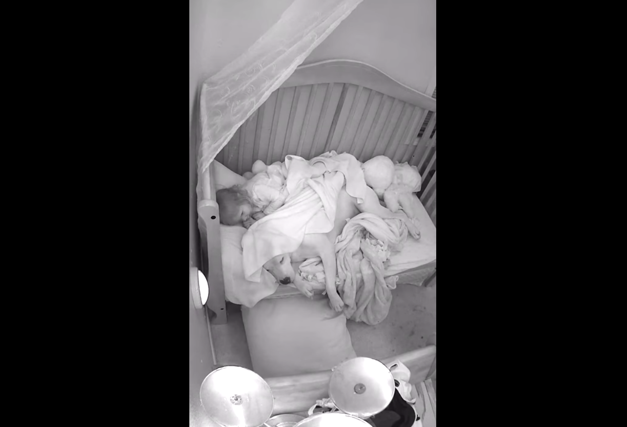 Un vídeo de una cámara de seguridad muestra a una pequeña mientras tapa a un enorme perro acostado a su lado.
