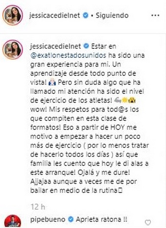“A partir de hoy me motivo empezar a hacer un poco más de ejercicio (por lo menos tratar de hacerlo todos los días) así que familia les cuento que hoy le di alas a este arranque! Ojalá y me dure! aunque a veces me de por bailar en medio de la rutina” (sic), fueron las palabras que acompañaron el video de la presentadora Jessica Cediel.