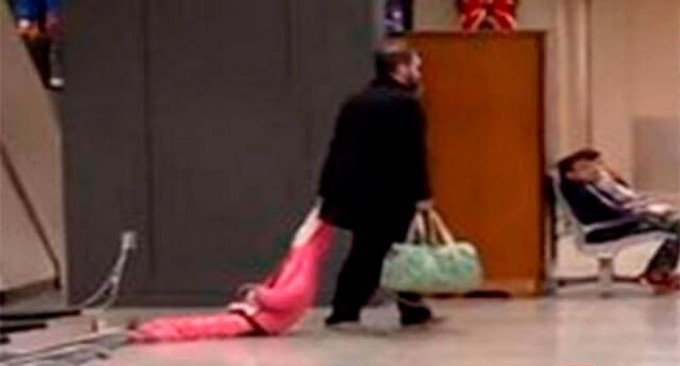Viral se ha hecho un video en donde se ve a un padre que arrastra a su hija por la capucha de su chaqueta para llegar a tiempo a la sala de abordaje.