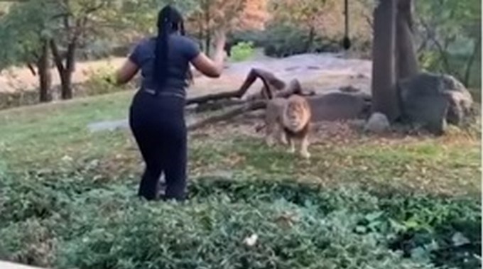 En video quedó el momento en el que la mujer ingresa sin autorización a la fosa de los leones, el aterrador instante se vivió en un zoológico de Nueva York.