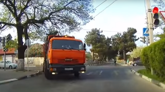 Un impresionante accidente fue filmado por la cámara de un camión, cuando una joven residente de la ciudad de Gelendzhik, en Rusia, es atropellada por un camión y luego sale caminando como si nada hubiera pasado.