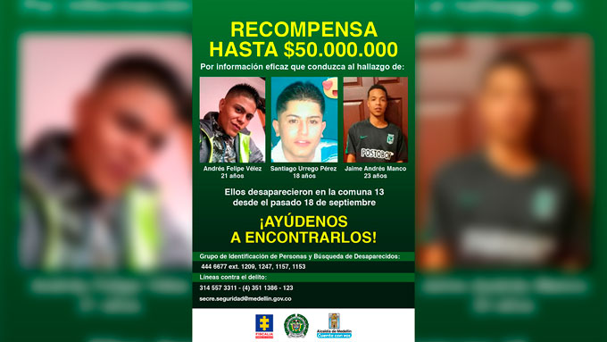 Minuto30.com- Un total de $50 millones de pesos ofrecieron las autoridades por información que conduzca con el paradero de Andrés Felipe Vélez, Santiago Urrego Pérez y Jaime Andrés Manco, de 21, 18 y 23 años respectivamente, desaparecidos desde el pasado 18 de septiembre en la Comuna 13, San javier.
