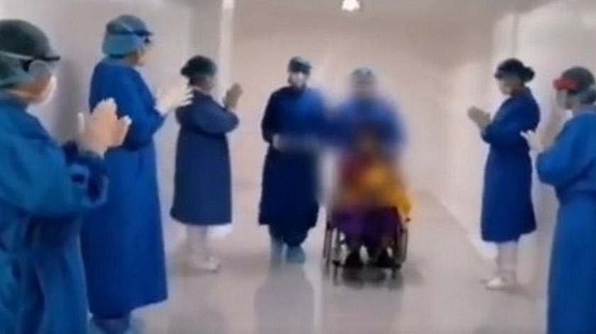 Entre aplausos el pequeño fue despedido por el equipo de trabajo de la clínica, mientras sonreía el pequeño le ‘agradeció’ al personal médico.