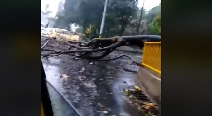 La caída de un árbol, debido a las torrenciales aguas que cayeron este mediodía en Medellín, afecta la movilidad en el sector Patio Bonito en el barrio El Poblado.
