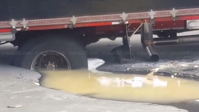 EN VIDEO: Un camión se vio afectado por fuga de agua, una llanta se quedó estancada