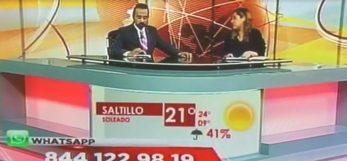 En el vídeo se observa al presentador de Saltillo de RCG, Pepe Mena, manipulando su celular mientras su compañera habla, cuando de repente se escucha el icónico sonido a todo volumen.