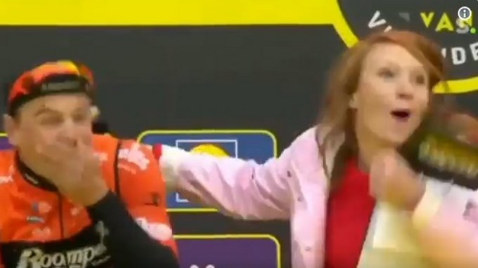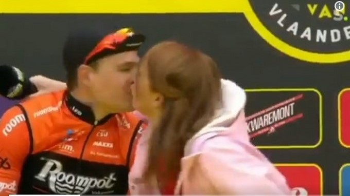 El ciclista belga Stijn Steels estaba en una entrevista luego de participar en el Tour de Flandes con una joven reportera, quienes tuvieron un malentendido en la despedida, sin querer se dieron un pico en la boca.