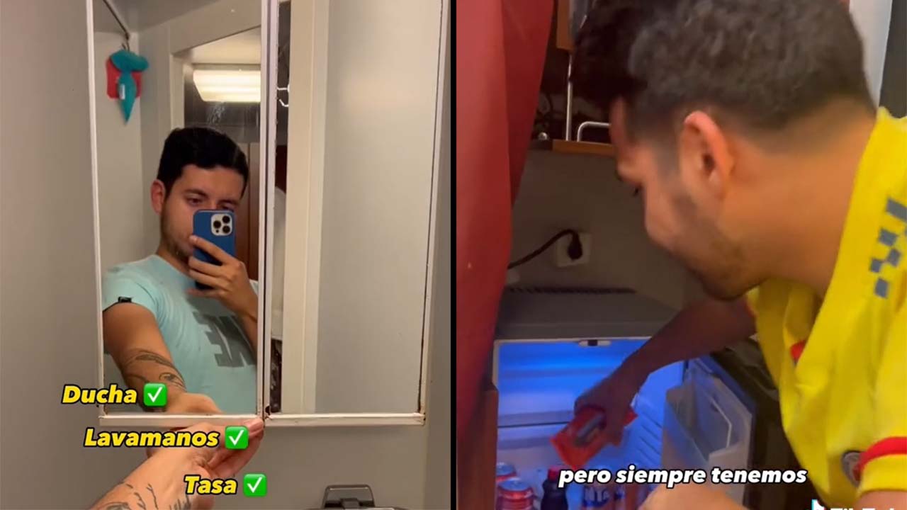 En el video el colombiano empieza relatando que para ingresar necesita un tarjeta, explica que aunque el baño es pequeño tiene lo necesario para vivir “ducha, lavamanos, taza y cajones”.
