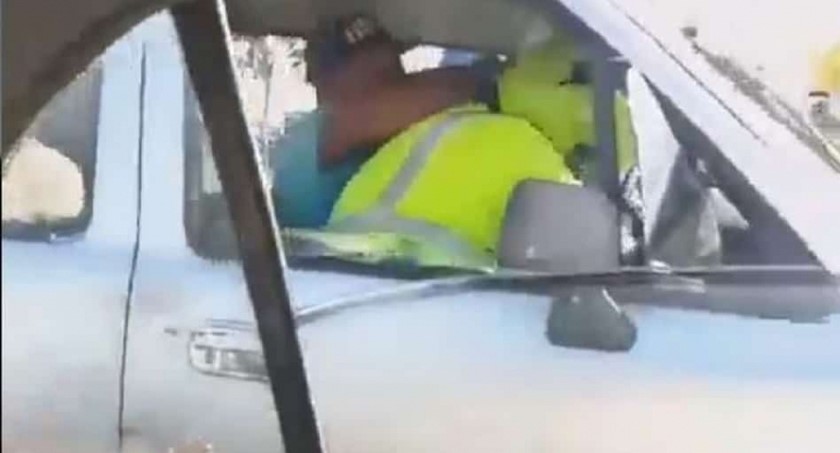 En la imagen se aprecia que un policía se subió a la camioneta Dacia para detener al conductor, y es allí cuando el hombre arremete a golpes contra el uniformado.