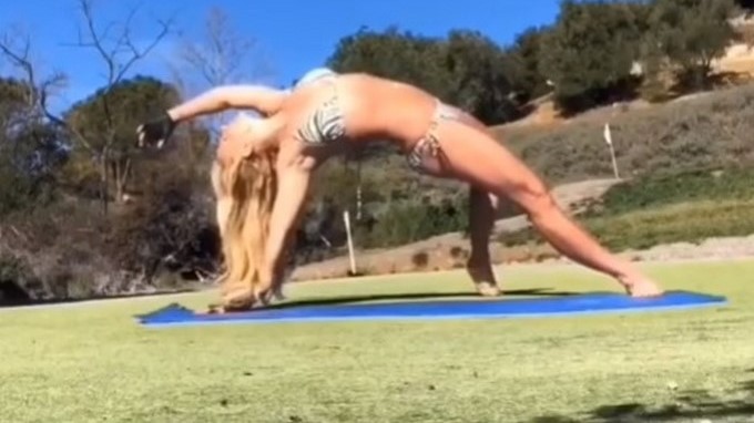 Spears muestra que quiere empezar una vida más saludable, muestra algunas posiciones de yoga y su conservada figura. El video lo acompaño con este mensaje, “Yoga on the green 😜😌I really like it LIKE THAT !”.