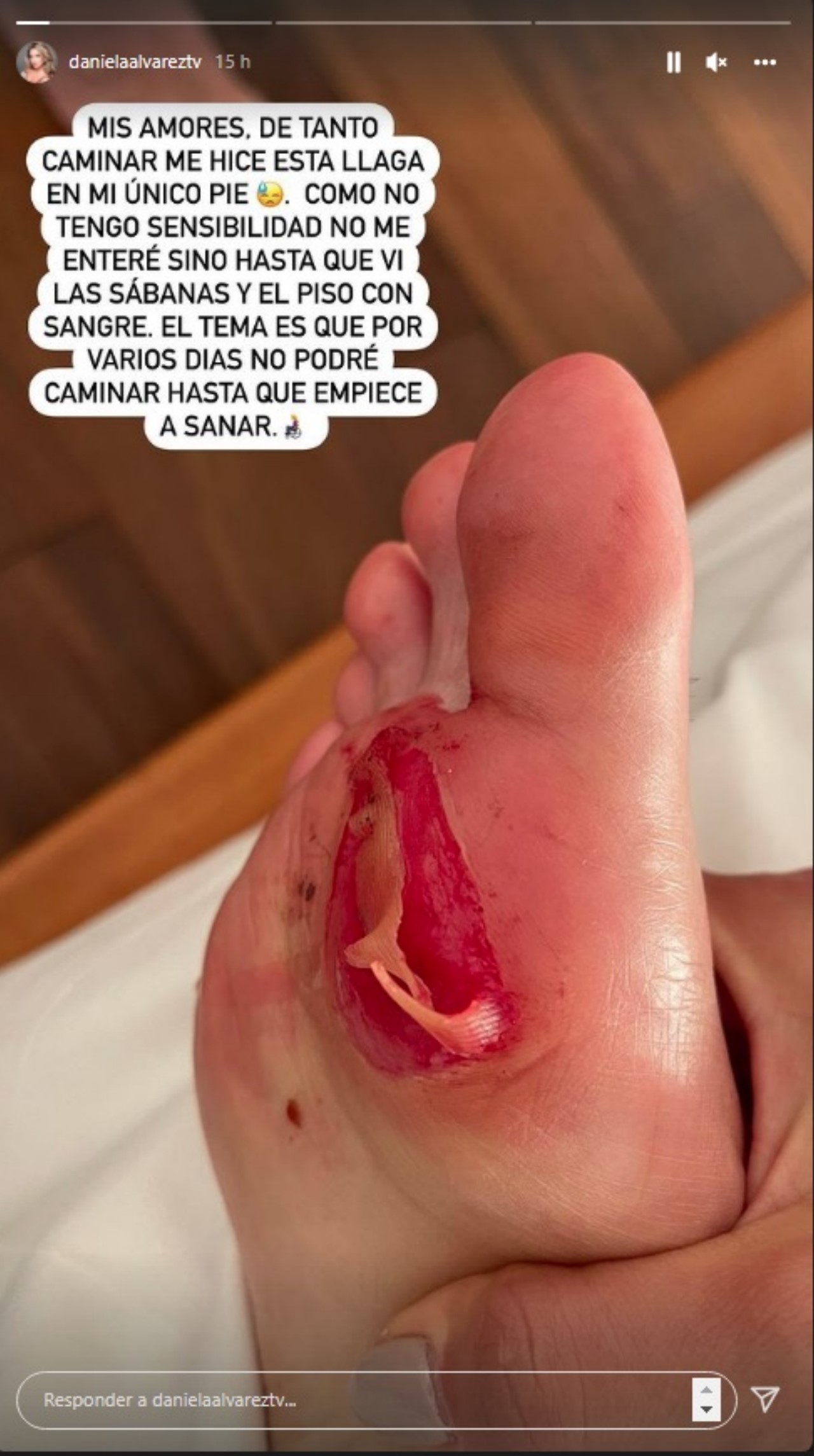 “Cómo les conté me hice una herida en mi único 🦶por caminar mucho. Por mi falta de sensibilidad no me di cuenta y ahora debo tener paciencia mientras me vuelve a salir piel (en un pie sin sensibilidad es mucho más lento)”, dijo Daniela Álvarez en su cuenta de Instagram.