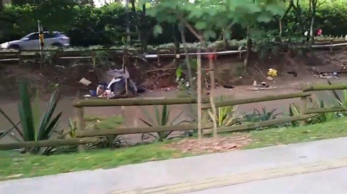 Un habitante de Belén, Medellín, compartió un video en el que se muestra a varias personas y sus pertenencias en las orillas de la canalización frente al centro de salud de Belén.