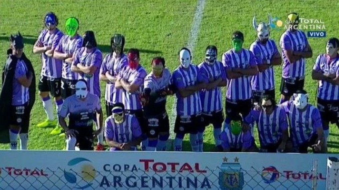 El plantel que hoy marcha líder del torneo de Primera C, posó ante las cámaras con máscaras de superhéroes.