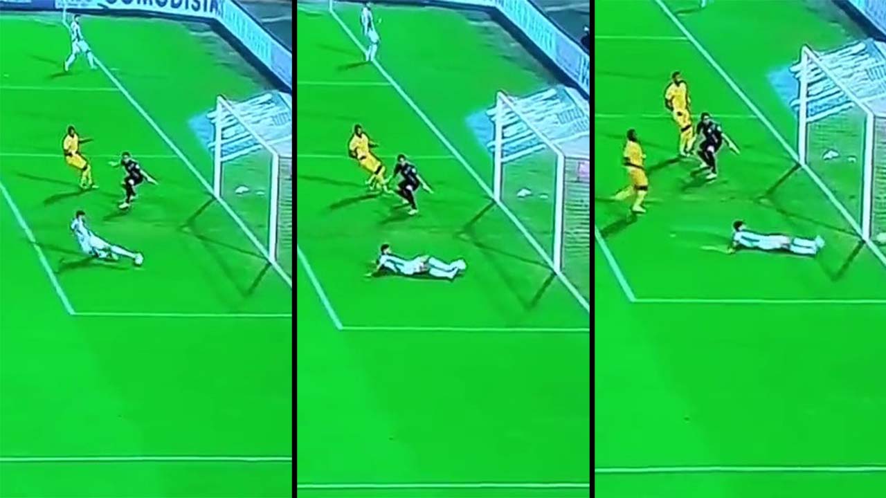 La jugada insólita, ocurrió cuando el delantero recibió un pase desde la banda izquierda por parte de ‘Maxi’ Cantera, el jugador cazó bien el balón, quedó solo frente al arco con la defensa y el portero del cuadro visitantes vencidos.