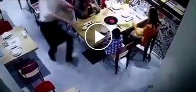 El hombre trae en su bandeja un líquido hirviendo, pero en los segundos que lo acercan a la mesa pasa lo peor, y termina derramando todo el contenido sobre un niño.