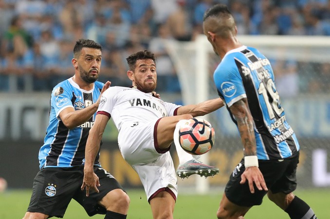 Edílson Mendes Guimarães (i) y Lucas Barrios (d) de Grêmio disputan el balón con Lautaro Germán Acosta (c) de Lanús durante el partido de ida por la final de la Copa Libertadores entre Grêmio y Lanús. EFE