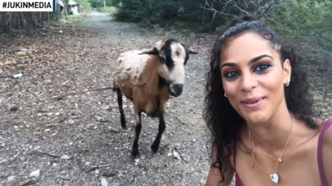Esta mujer se da cuenta que la cabra está medio alterada y la quiere embestir, sin embargo lo toma con gracia y se queda en su sitio para tomar la foto. Acto seguido, al cabra retrocede, toma impulso y le da una cabezazo de Padre y Señor Nuestro que tumba de inmediato a la joven.