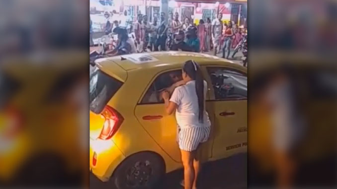 La joven fue captada mientras hace que su pareja se baje del automóvil, en tanto que curiosos los ven y los graban.