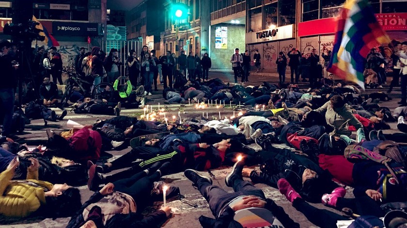Manifestantes encendieron velas y se acostaron en el piso rodeando el lugar donde cayó herido #DylanCruz a manos del ESMAD. Dylan está en estado crítico con pronóstico reservado en UCI del H. San Ignacio. Marchas avanzan, cacerolazos retumban. ¿Nos matarán a todos? #EsmadAsesino pic.twitter.com/tcYIpyPc80