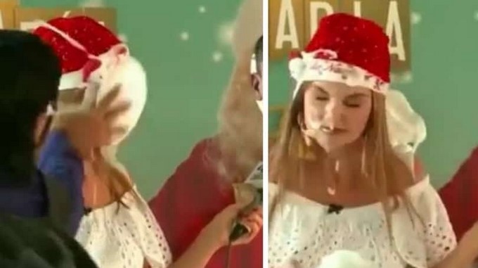 En medio de la entrevista y por sorpresa un hombre le lanzó el pastel a la presentadora, la cual reaccionó bastante profesional y continuo como si nada.