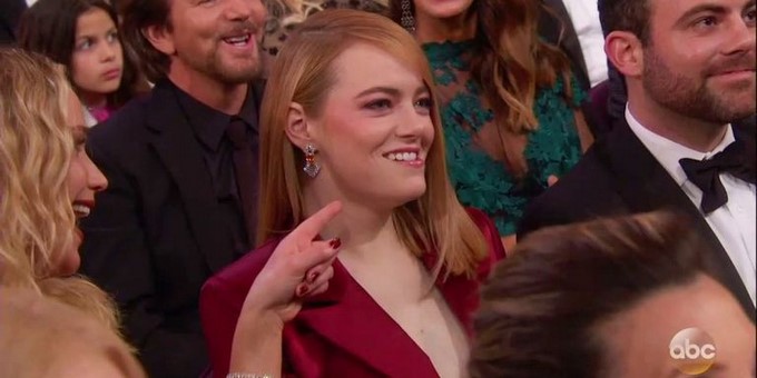 Cuando estaban sentadas, las actrices no lograron contener la risa durante el monólogo de apertura de Jimmy Kimmel, quien le recordó a Stone el incidente de la versión pasada cuando Warren Beatty y Faye Dunaway se equivocaron y anunciaron que la ganadora había sido La La Land, filme que protagonizó Stone.