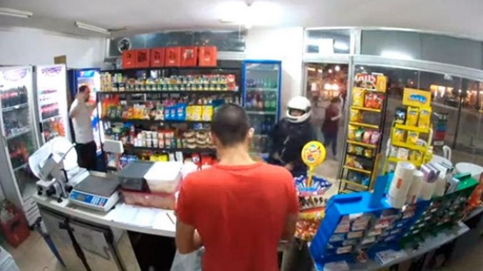 La cámara de seguridad del lugar captó el momento en que el sujeto ingresa al establecimiento con un casco puesto y armado con una pistola, en primer lugar intimida a un cliente para luego dirigirse al empleado de la caja registradora, es en este momento cuando intenta guardar el arma en su pantalón y la detona por error.