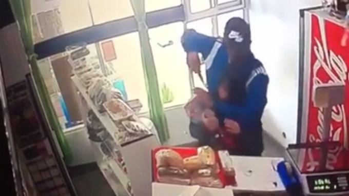 El sujeto entró muy sigiloso a una panadería, donde se encuentran la propietaria y una cliente, de repente saca un cuchillo de gran tamaño, toma como rehén a la compradora y amenaza con degollarla si no le entregan el dinero.