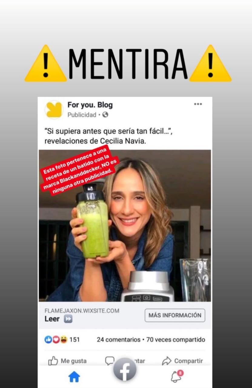 La actriz Cecilia ‘Chichila’ Navia está denunciando a través de sus redes sociales el uso ilegal de su imagen en la promoción de un supuesto producto para bajar de peso. Todo se trata de una ¡ESTAFA!
