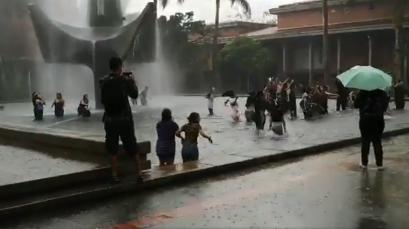 En medio del fuerte aguacero que se registró este viernes en Medellín, un grupo de estudiantes de la Universidad de Antioquia aprovecharon y se dieron un ‘chapuzón’ en la emblemática fuente que hay en el campus principal.