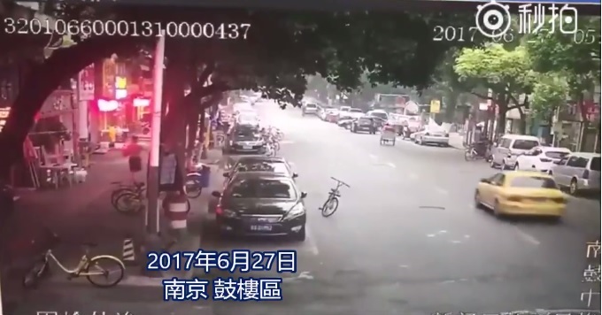 Esta persona camina justo en la acera donde en pocos segundos ocurrirá una emergencia de gran proporción, ocasionada por la fuga de gas en un restaurante en la provincia china de Nanjing.