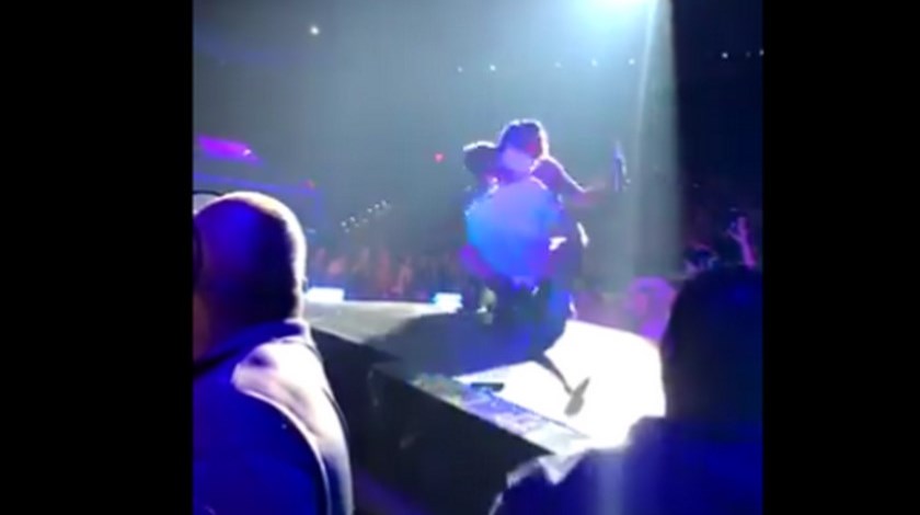 Un seguidor le agarraba con sus brazos y se cayeron del escenario.