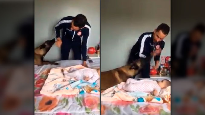 En el video se ve simular al hombre que le pega a su bebé que estaba recostado en la cama, cuando el perrito escucha regañarlo de inmediato corre a proteger al pequeño.