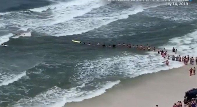 Decenas de personas que se encontraba el pasado domingo 14 de julio en la playa de Panama City, en Florida, Estados Unidos, se organizaron para formar una cadena humana y rescatar a dos nadadores que estaba atrapados en las fuertes corrientes ocasionadas por el huracán Barry.