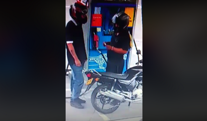 Las imágenes muestran como dos hombres vestidos de negro, que nunca se quitaron su casco, llegaron a una isla en la estación de gasolina y comenzaron a tanquear su motocicleta. Luego de finalizar el proceso, y al acercarse al sujeto que los atendió, ambos lo intimidaron con un arma de fuego y comenzaron a revisarle los bolsillos, sacando el dinero que tenía en ese momento.