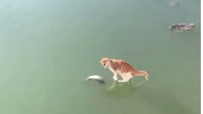 Por medio de Twitter la agencia de noticias Xinhua publicó un video donde se ve un gato realizando varias acrobacias sobre un estanque congelado mientras trata de atrapar un pez.