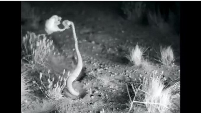 El video dejó ver como la cascabel intentó atemorizar a la rata, pero ella hace un giro de 90 grados y logró patearle la cabeza dejando que el reptil en el suelo con la boca abierta y llena de polvo.
