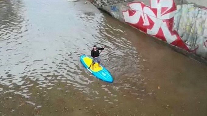 Las imágenes y videos del sujeto navegando en la vía inundada es viral en redes sociales.