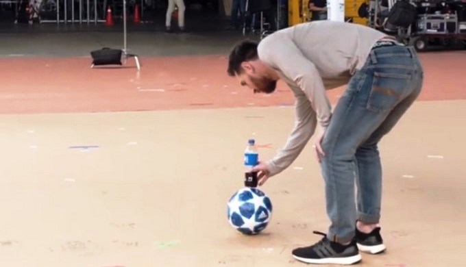 En video quedó registrada la acción que el crack del FC Barcelona, Leo Messi, ejecuta ante las cámaras con una pelota y una botella de gaseosa.