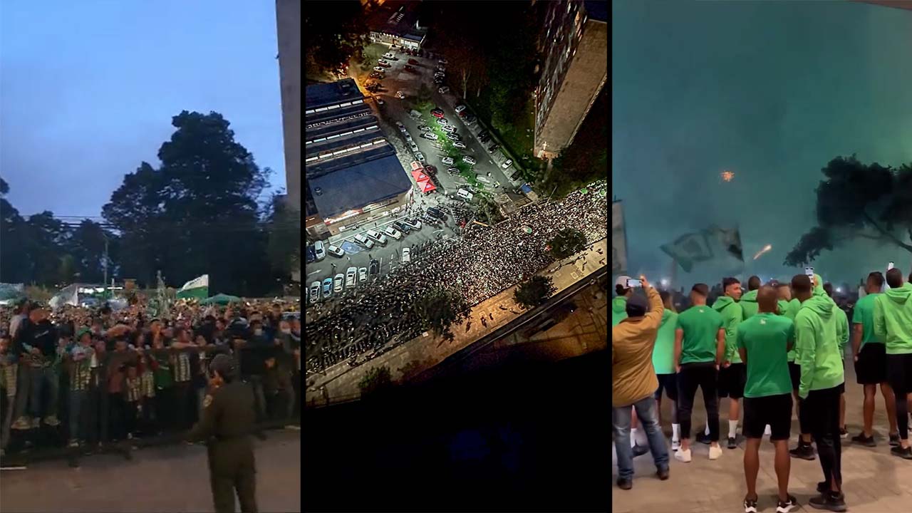 Con un impresionante banderazo, los hinchas del Atlético Nacional se reunieron afuera del hotel donde se hospedan los jugadores verdolagas para alentarlos.