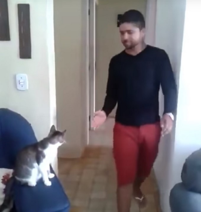En el video se muestra un gato en un sofá, de repente llega su dueño a quien saluda con su pata.