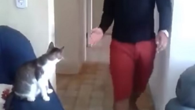 En el video se muestra un gato en un sofá, de repente llega su dueño a quien saluda con su pata.
