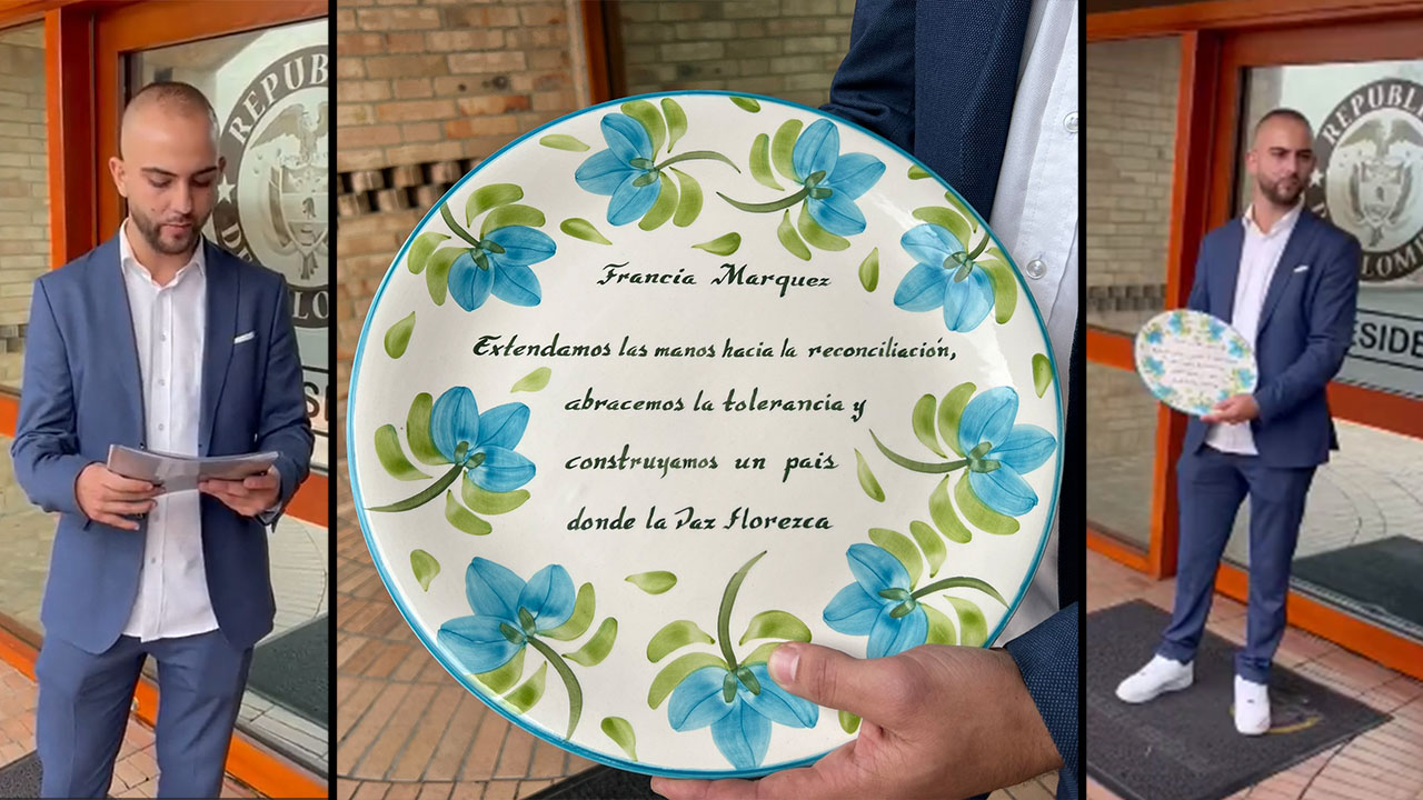 El plato de loza que entregó el joven, tenía escrito la frase “extendamos las manos hacia la reconciliación, abracemos la tolerancia, y construyamos un país donde la paz florezca”.