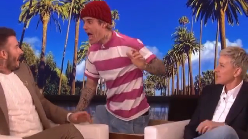 El cantante Justin Bieber, en complicidad con Ellen DeGeneres, intentó asustar al exfutbolista David Beckham, como acostumbran a hacer en el show de la presentadora estadounidense, pero el británico terminó más sorprendido y agradecido que asustado.