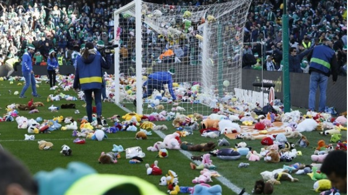 Los aficionados del Real Betis Balompié, de España, lanzó cientos de peluches al terreno de juego durante el descanso de un partido, con el fin de participar en una iniciativa solidaria que llevará durante estas fiestas juguetes a los niños más desfavorecidos.