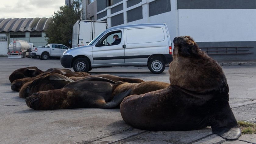 Ante la falta de turistas por la pandemia del coronavirus y las medidas de cuarentena tomadas por el gobierno de Argentina, los lobos marinos de Mar del Plata pueden moverse plácidamente en las calles adyacentes de un puerto de la ciudad.