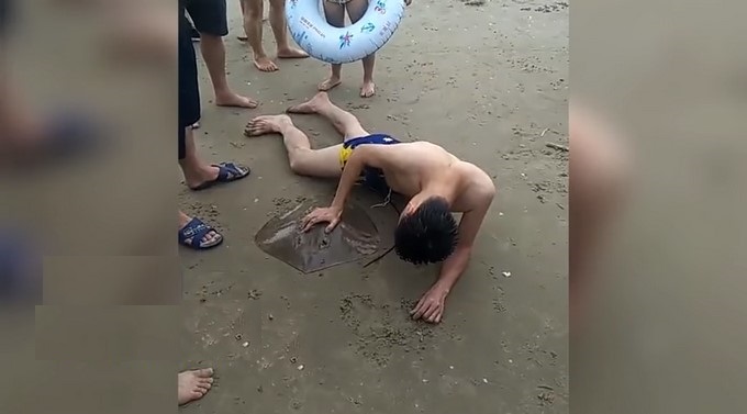 Un hombre estaba disfrutando de un soleado día en la playa el pasado sábado en la ciudad de Sanya, China, cuando fue impresionado por una mantarraya.