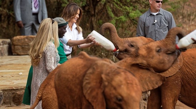 La primera dama visitó un parque Parque Nacional cerca de Nairobi donde alimento a elefantes bebés y la reportera de la Casa Blanca, Jennifer Jacobs acompañó a Melania y afirmó en Twitter “En la alimentación de elefantes bebés en un Parque Nacional cerca de Nairobi, la primera dama se rió más de lo que los periodistas recuerdan haber presenciado”.