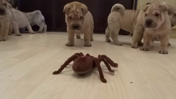 Estas ocho crías de Shar Pei, con cinco meses de nacidas tuvieron una batalla campal con un temido rival, una araña de juguete.