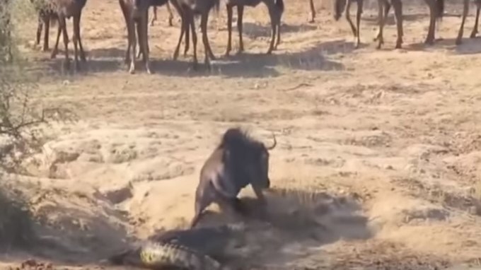El cocodrilo corrió hasta morder una de las patas traseras del animal, lo que no le permitía escaparse, lo llevo hasta lo más profundo del agua e intentaba hundirlo con todas sus fuerzas, pero todos los intentos fueron en vano, ya que aparecieron dos hipopótamos que estaban sumergidos, y se debatieron frente a frente con el agresor, decididos a ayudar a la víctima. Al final el animal desconocido logró escaparse de las garras del malhechor.