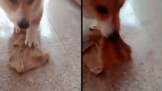 En el video se observa cómo el perro transporta el trapo en su hocico, lo pone sobre los ‘orines’ y utiliza una de sus patas para limpiar.